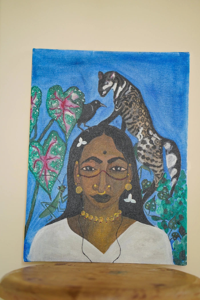 In this work, a Malabar civet climbs gently onto the woman’s head while she looks straight ahead with an open gaze. The Malabar civet, once found across the forests of the Western Ghats, is now rarely seen. A shy creature of the night, it moves softly through its surroundings, careful and quiet. The woman carries markings on her face and wears her jewellery with a sense of memory and belonging. These adornments hold stories of land, culture and identity.