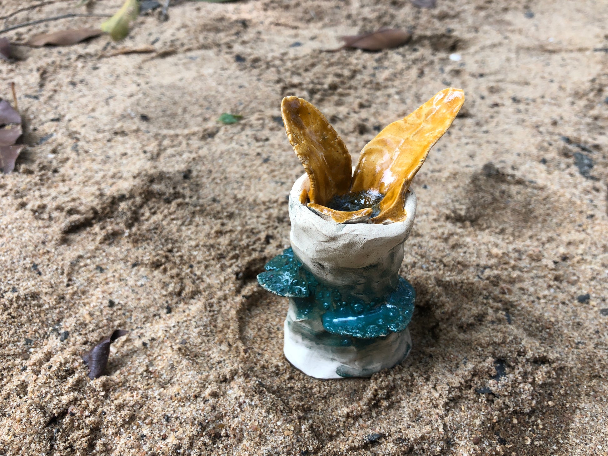 A lively combination of flowers and leaves bursts from the trunk, transforming the tree into a vibrant interplay of forms. Surabhi blends structure with whimsy here, letting foliage and bloom coexist in a playful rhythm that highlights her intuitive approach to sculptural making.