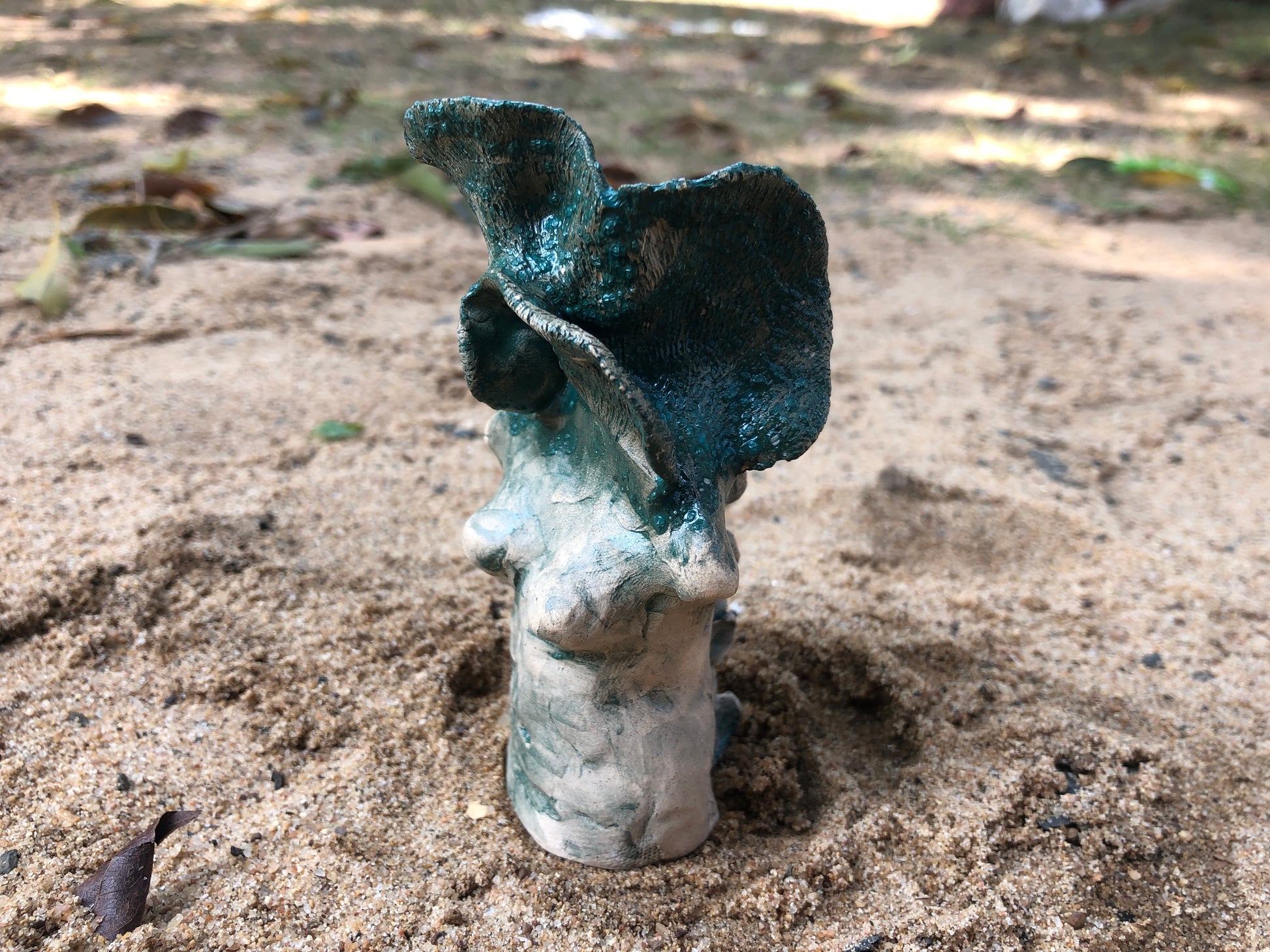 A textured female torso topped with a leaf for a head.